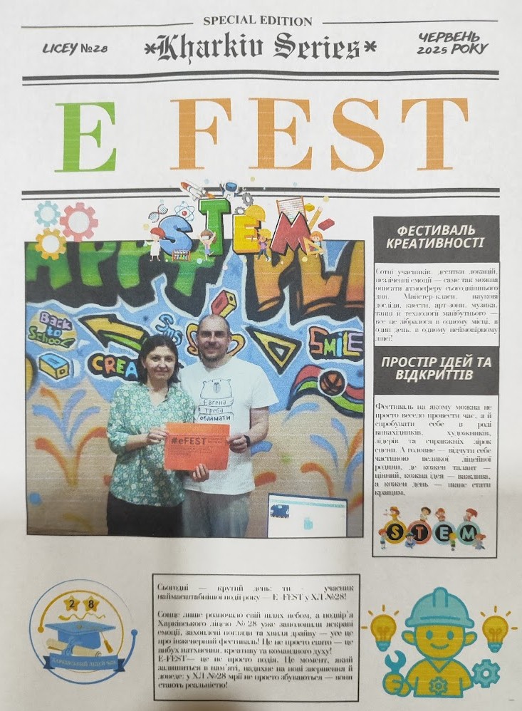 04 червня 2025 року викладачі кафедри інформатики Харківського національного педагогічного університету імені Г.С. Сковороди, Остапенко Людмила Петрівна та Шакуров Євген Олексійович, раді були взяти участь у грандіозній національній освітній ініціативі — Інженерному фестивалі #eFEST, що проходив у Харківському ліцеї №28. Організаторами фестивалю виступили ГО «Про.Про.Лаб» за підтримки Nova Ukraine. Наша участь сприяє популяризації STEM-напрямів і підтримці талановитої молоді в Харкові